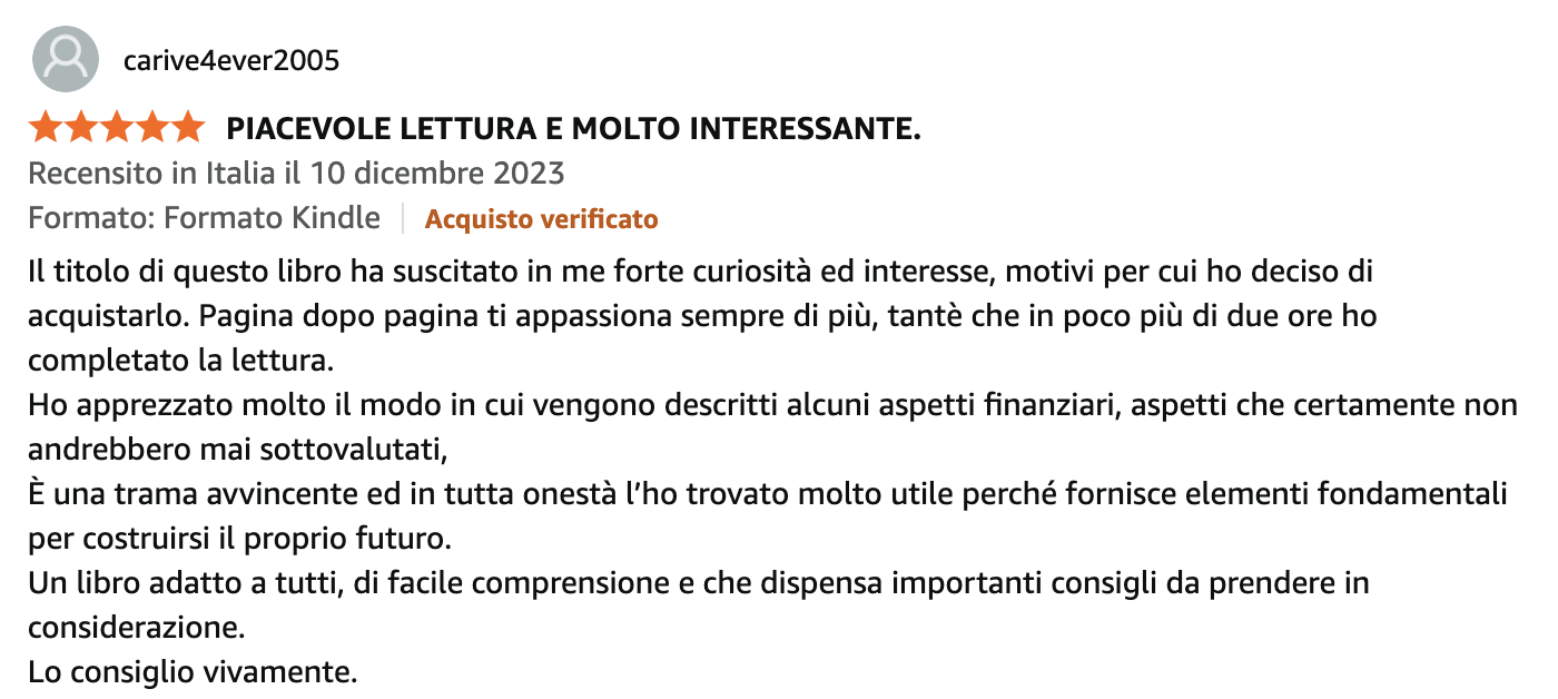 Prendi il libro oggi, applica ciò che trovi al suo interno, e sono sicuro che avrà un effetto incredibile sulla tua tranquillità finanziaria e sulla protezione della tua famiglia.